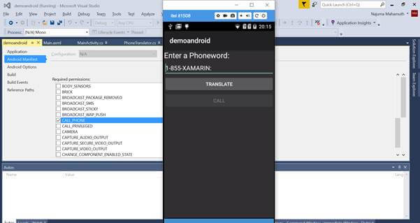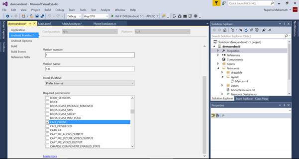 Click Android Manifest under Properties, go for Required Permissions – enable CALL_PHONE permission.