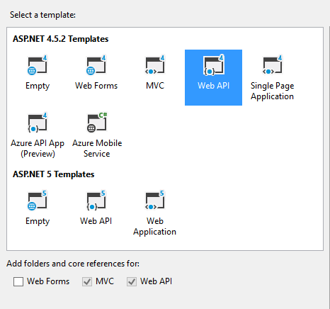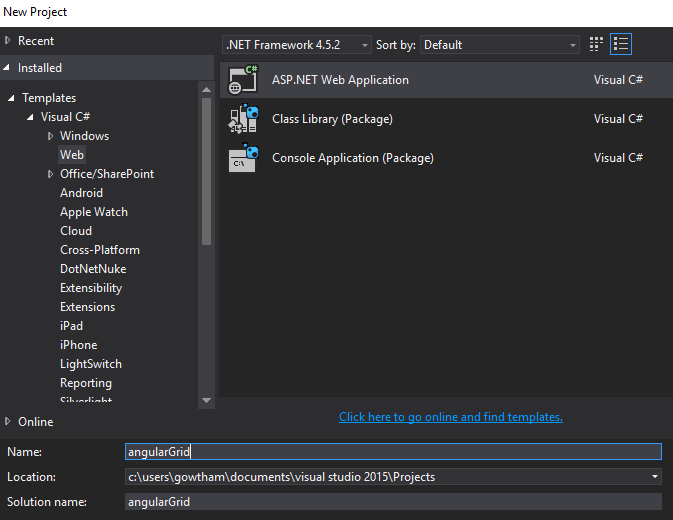 Create a Web API application using an installed web template in Visual Studio as in the following figures: