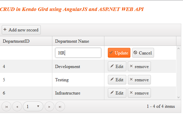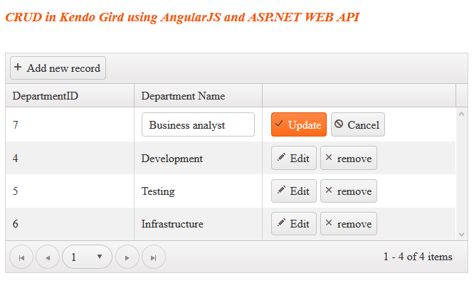 - <h3 style="font-style:italic;color:#F35800">CRUD in Kendo Gird using AngularJS and ASP.NET WEB API </h3>