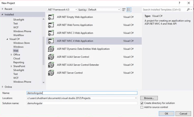 - Select ASP.NET MVC 4 Web Application.