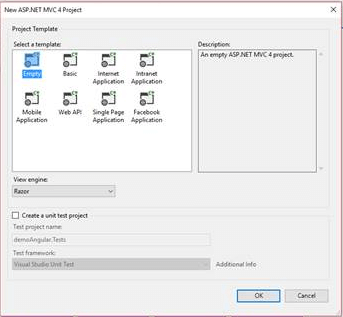 - Now, select the project template "Empty" or "Basic"; and the View engine will be razor.