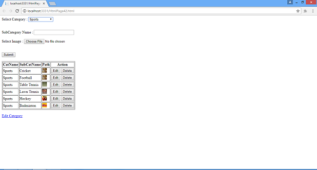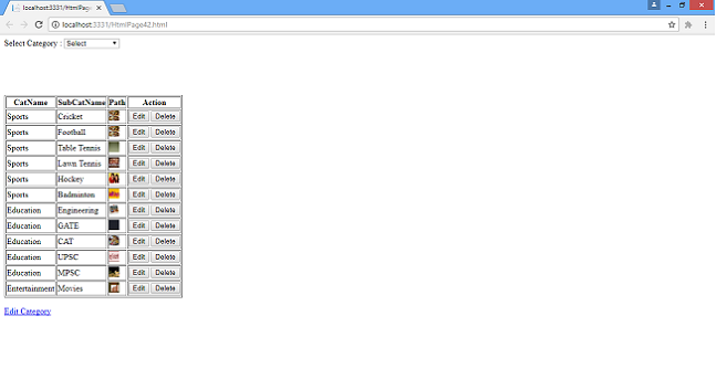 Next there is a div which contains catName textbox which is initially not visible and will be visible when user clicks edit button.The div also contains Update and Cancel button to update catName or Cancel the updation respectively.