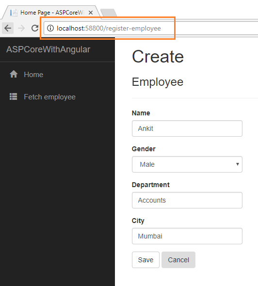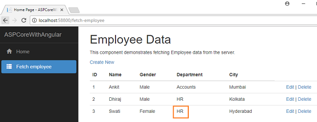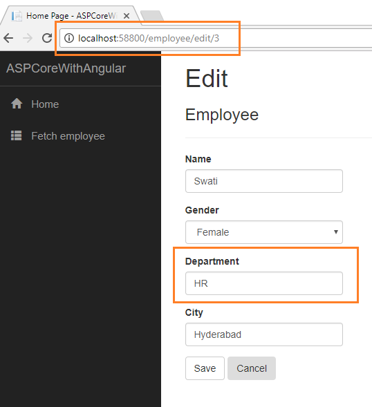 If we want to edit an existing employee record, then click Edit action link. It will open Edit page as below where we can change the employee data. Notice that we have passed employee id in the URL parameter.