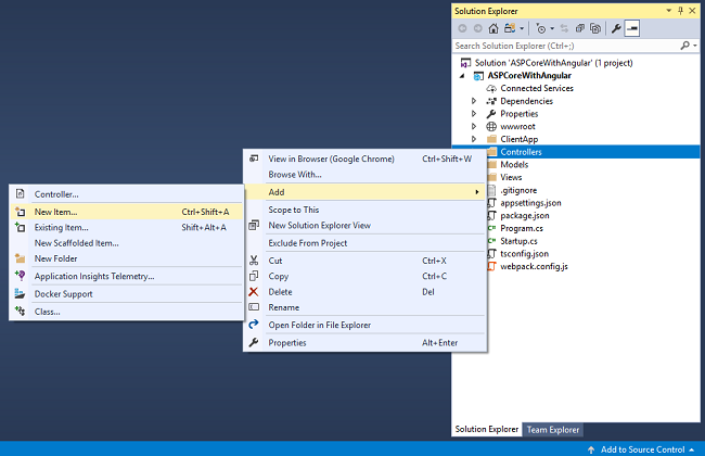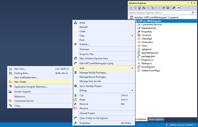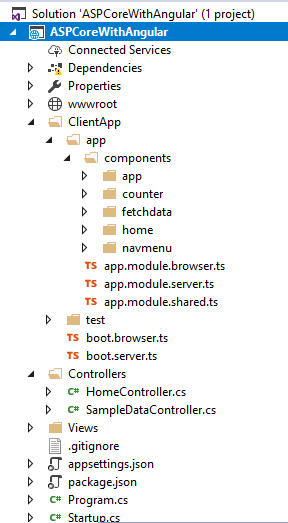 Controllers folders will contain our Web API Controller. The point of interest for us is the ClientApp folder where client side of our application resides. Inside the