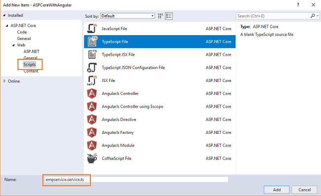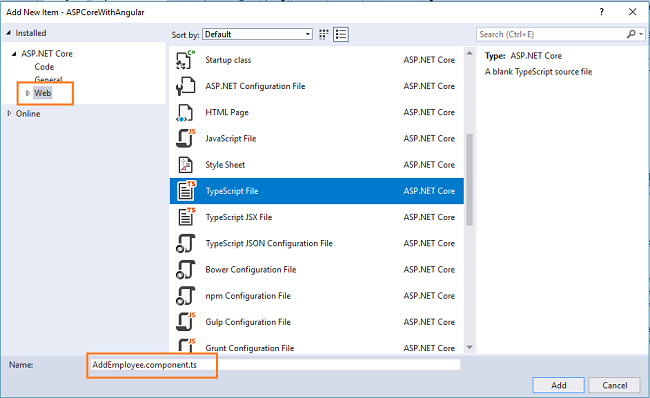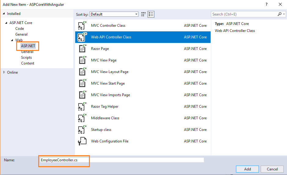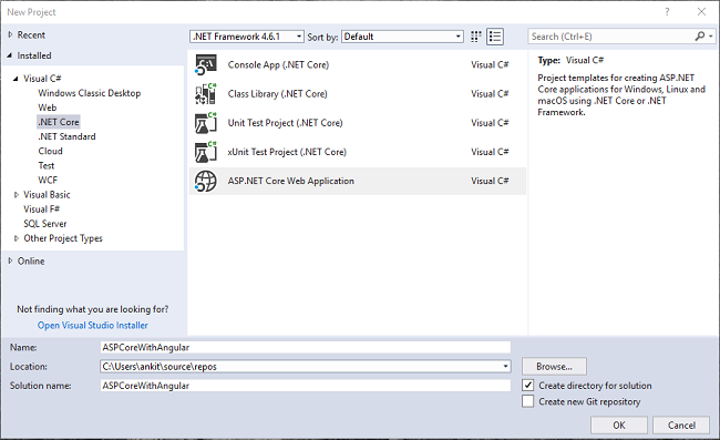ASPCoreWithAngular and press OK. Refer to the image below.