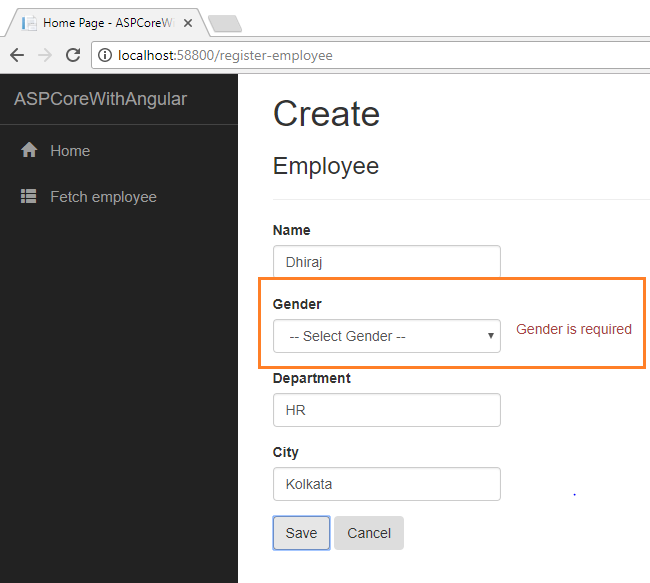 Here you can observe that we have attribute [formGroup]="employeeForm”, which is our defined form group name in Addemployee.component.ts file. “(ngSubmit)="save()" will invoke our save method on form submit.