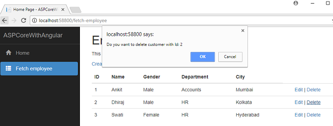 Now, we will perform Delete operation on an employee named Dhiraj having Employee ID 2. Click on Delete action link which will open a javascript confirmation box asking for a confirmation to delete.