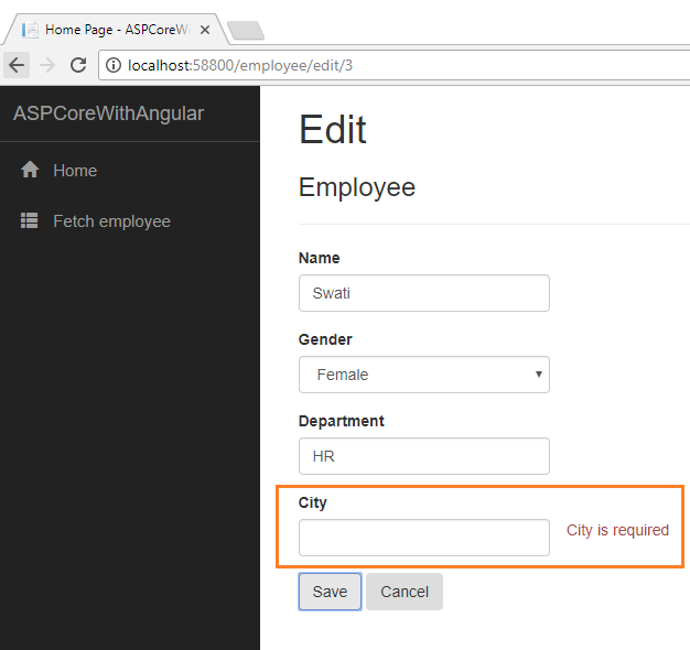 If we miss any fields while editing employee records, then Edit view will also throw required field validation error message as shown in the image below.