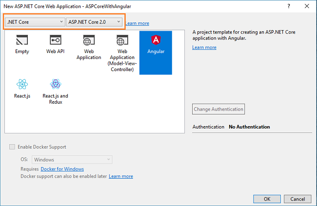 After clicking on OK, a new dialog will open asking to select the project template. You can observe two drop-down menus at the top left of the template window. Select “.NET Core” and “ASP.NET Core 2.0” from these dropdowns. Then, select “Angular” template and press OK.