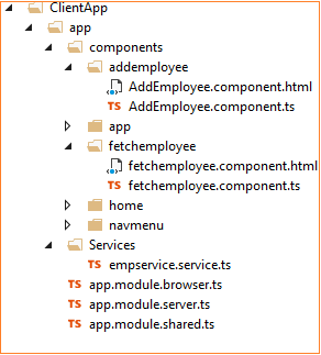ClientApp/app/components folder, we already have few components created which are provided by default with the Angular template in VS 2017. These components won’t affect our application, but for the sake of this tutorial, we will delete