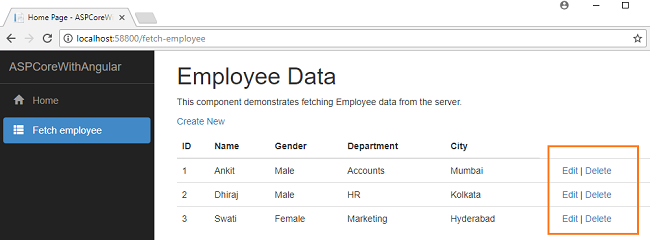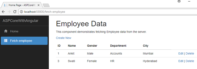 /fetch-employee page, displaying records of all the employees. Here, we can also see action methods Edit and Delete.