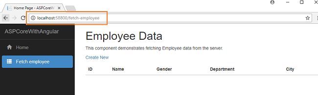 A web page will open as shown in the image below. Notice the URL showing route for our home component. And navigation menu on the left showing navigation link for Home and Fetch Employee pages.