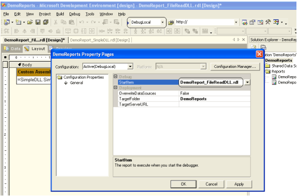 Now when you view the report in DebugLocal mode now, instead of see the text from the text file you will see a message #Error in the text box. To switch to debuglocal mode just change the mode of execution to DebugLocal and right click Project properties and set the StartItem with the report you want to debug.