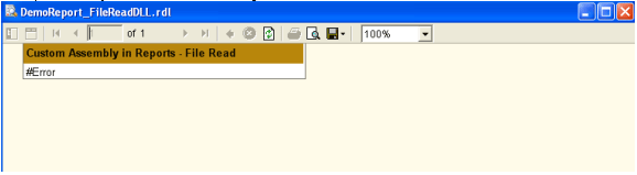 If you preview the report in Report Designer, the report runs all the report expressions by using the FullTrust permission set. The report does not use the security policy settings. But when you run the report in DebugLocal mode or deploy report to the report server and view it in report manager you will receive the message #Error, This problem may occur when the custom assemblies that are referenced in your report do not have sufficient permission