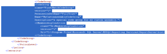 In the config file we need to add the code group we can add the following code. We have to place this under the correct CodeGroup node in order to work correctly. So you will need to put it under the last code group.