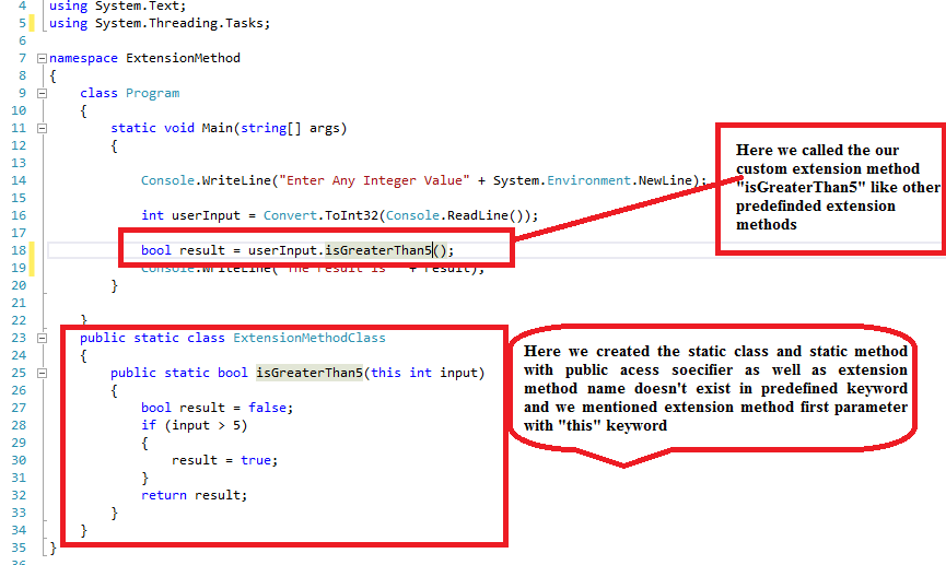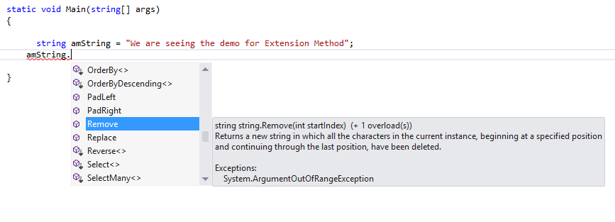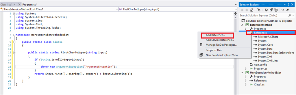 Here, Class1 is the Class Library Class and the FirstCharToUpper is our Extension Method.
