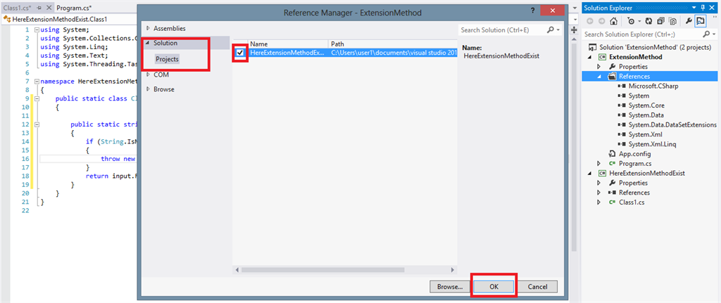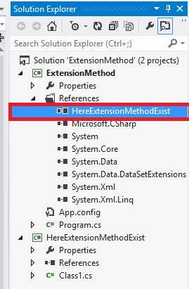 In the below image, you can see that the HereExtensionMethodExist class library is added as reference to our respective class.