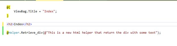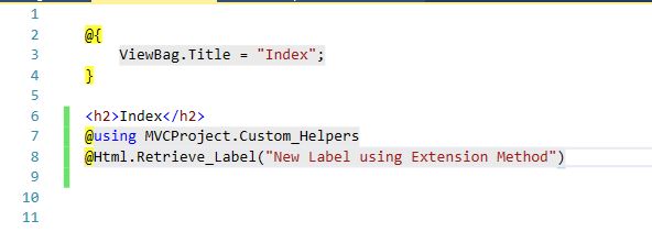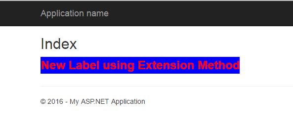In the above code, we created a simple extension method for built in HTML helper class. The Retrieve_Label method takes two parameters, first parameter defines the object of HtmlHelper class and second parameter defis the content that we will place into label text. We can use this html extension method using the @Html as below.