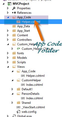 In the above method there is a problem that this razor html helper is only accessible in current view. We can’t access this razor html helper outside the index view. If we want to use the razor created helpers in multiple views, then first create a App_Code directory and create a view in this directory that will contain the custom helper.