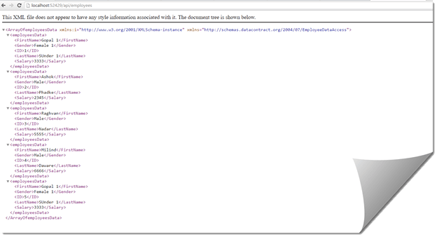 Notice that we are getting list of all employees. So out GetDetails () method within our EmployeesController is mapped to the HTTP verb and it works as expected.