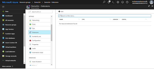 Here, I am going to create a new text file on my C drive of a virtual machine by uploading an extension to the portal during runtime. For this, I have already deployed a Windows VM in my previous article.
