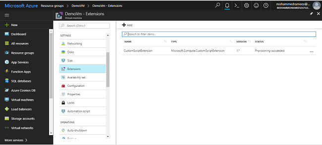 Save this script as CustomScriptDemo.ps1 and upload to the extensions and click OK. After a few seconds, on completion of the deployment, you can see the extension listed in the portal with status as provisioning succeeded.