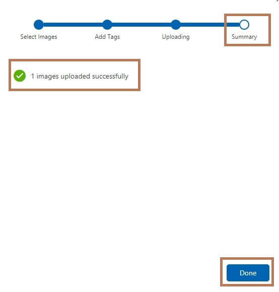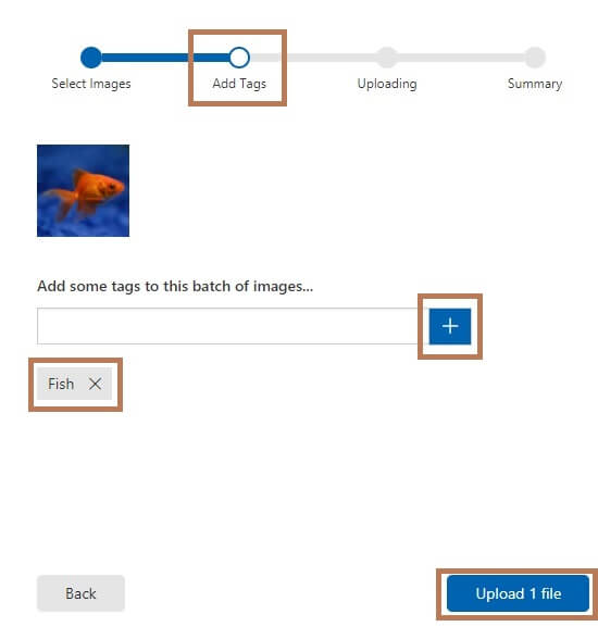 When you are done adding tags, click Upload (number) file. The upload could take some time if you have a large number of images or a slow internet connection