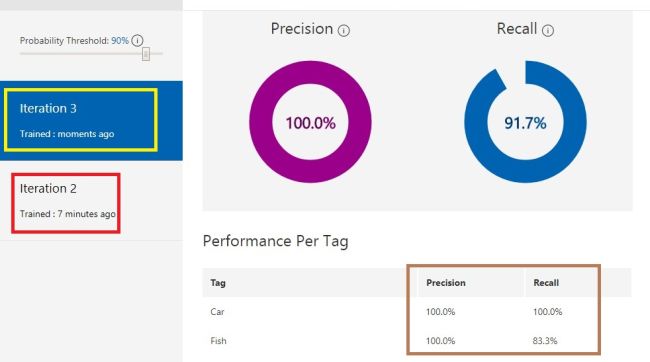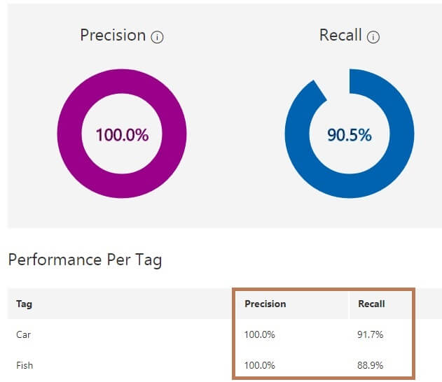 The precision and Recall indicator tell you how well your classifier is based on automatic testing. Custom Vision Service uses the images you submitted for training to calculate these numbers, using a process called K-Fold Cross Validation.
