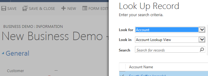 After placing this lookup field over our entity form, we can set an account or a contact in this field, as shown below: