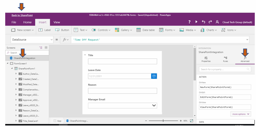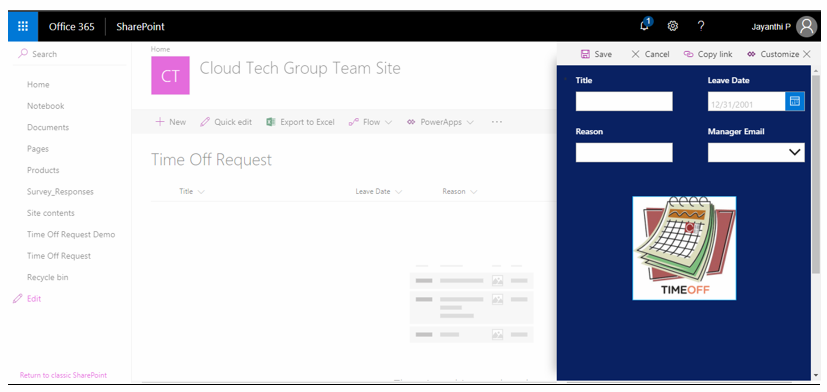 PowerApps Forms is directly integrated to the SharePoint List Modern UX. Using the modern experience, I’ve created a new SharePoint list called Time Off Request with some fields such as Leave Date, Reason, Leave Status, Manager Email, Approvers Comment.