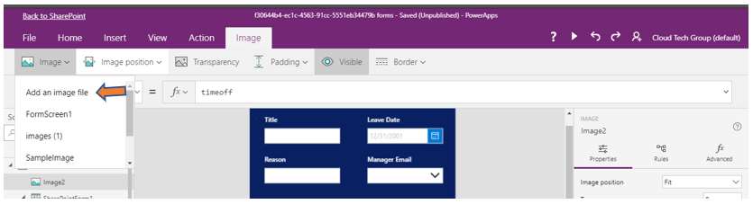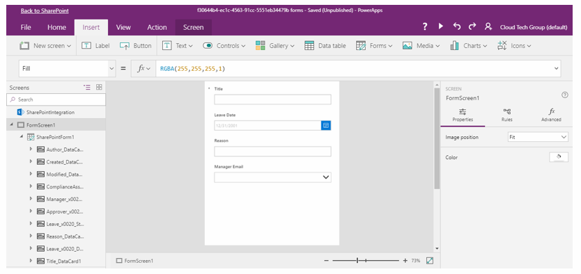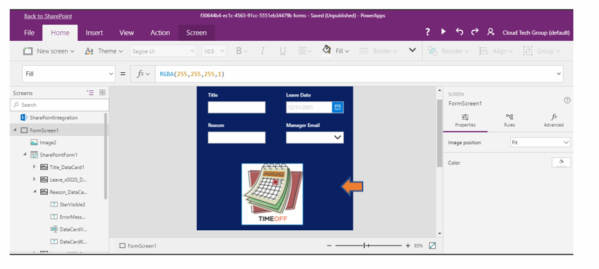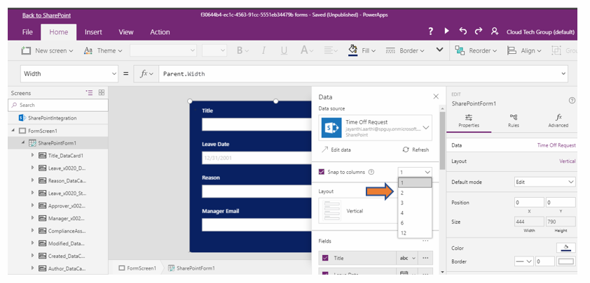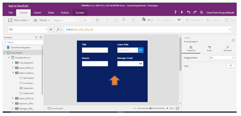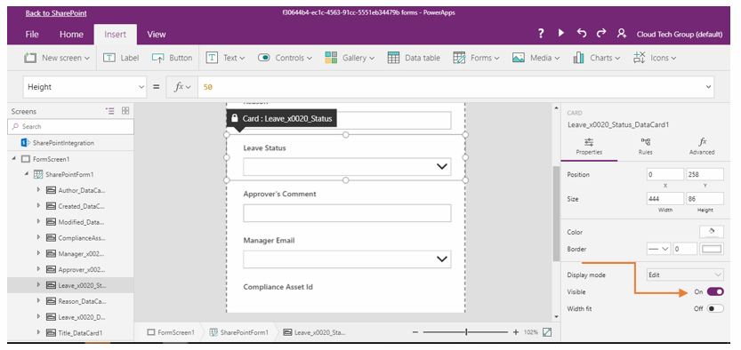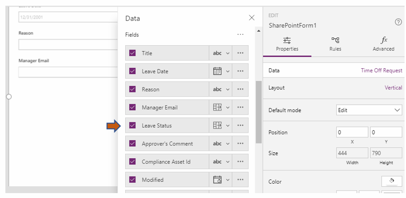 Let's say we have Leave Status, Approver Comments that you don't want visible. Hiding the field is easy in PowerApps - in the property options, just select the field and turn off the visibility