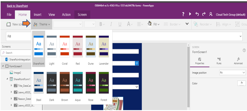 You can Fill colors and there are PowerApps themes that you can use to enhance the look and feel of the application to make it look very professional in a couple of clicks.