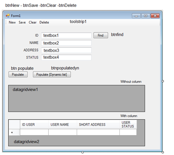 This button returns a list of class _user, and fills the grid. For this exercise columns were created in the grid, then the properties of the _user class are traversed and the Name value is assigned to the property of the dataGridView2.Columns [n] .DataPropertyName,