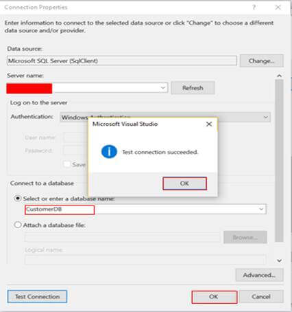 After clicking Next button, a new dialog box will pop up with the name Connection Properties. You need to enter your server name here. In order to connect to a database panel, select your database (Customer DB) via dropdown list. Then, click OK.