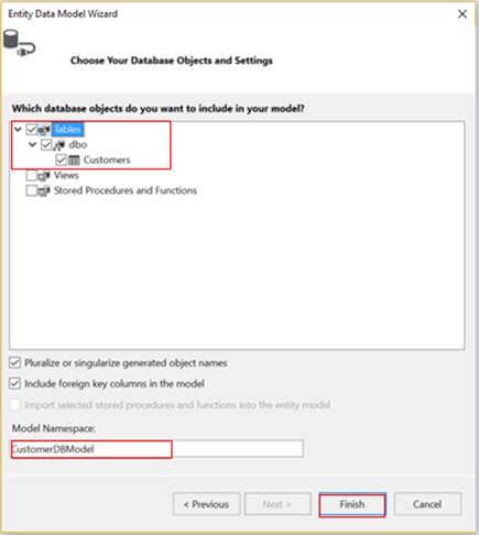 Now, Entity Data Model Wizard will pop up for choosing the object which we want to use. In our case, we choose Customers table and click Finish button. Finally, we see that EDMX model generates Customer class.