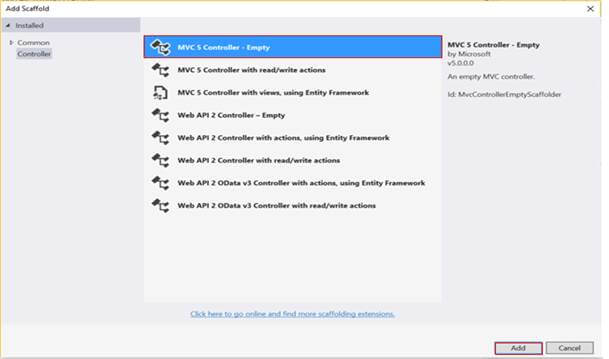 Right click on the Controllers folder > Add > Controller> select "MVC 5 Controller – Empty" > click Add.