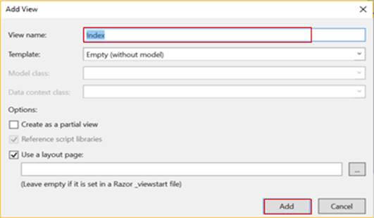 Right click on Index() action, select Add View. In the popped up dialog box, write a name for your View. Finally, click Add.