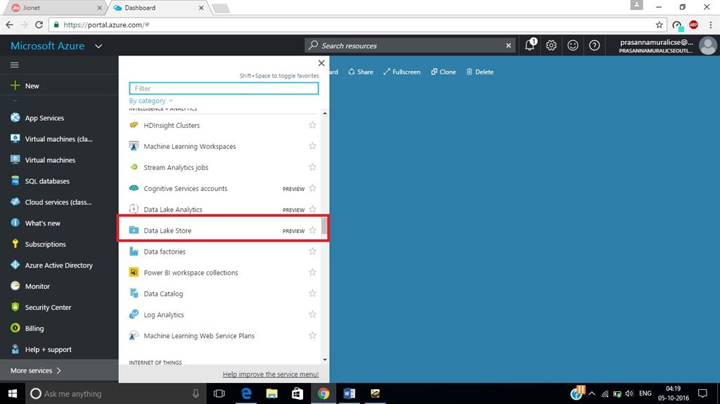 Log into Azure Management Portal by clicking the link for creating a Data Lake Store Service in Microsoft Azure.