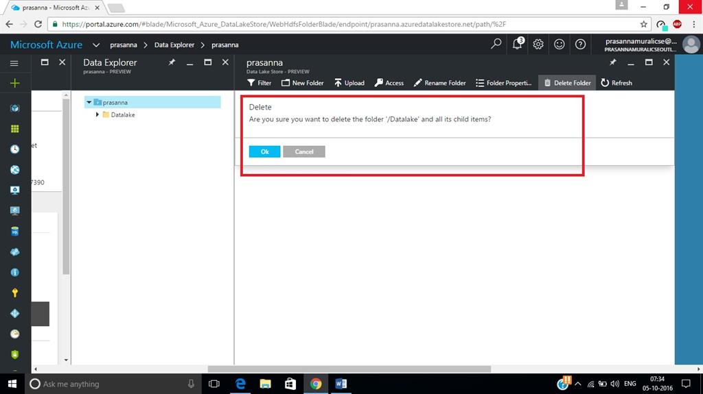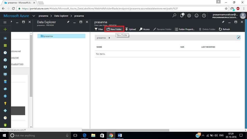 Open the Data Lake Store account that you just created. From the left pane, click Browse >> Data Lake Store. Now, from the Data Lake Store blade, click the account name under which you want to create folders.