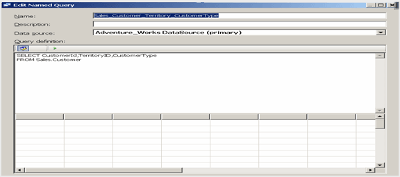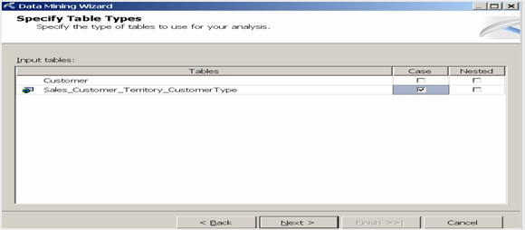 Next pages allow us to select the case table from some defined views, as well as whether the table is nested or not. In that case, the created named query Sales_Customer_Territory_CustomerType, as shown in Figure 5.
