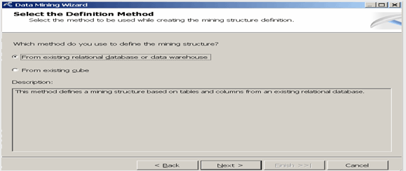 You can use Data Mining Wizard to create in one step the data mining structure and the data mining model objects. Right-click the Mining Structure Folder in the Solution Explorer and then choose New Mining Structure. On the first page, you choose whether you are creating a model from a relational or multidimensional source (an OLAP cube). Some mining algorithm doesn't support the creation of model from a cube. In our case, select "From existing relational database or data warehouse", as shown in Figure 3.