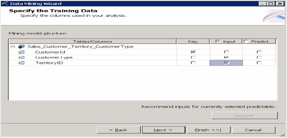 Now let's specify how the attributes are interpreted by the mining algorithm whether they are key, input or predictable. You may click on the suggest button to perform a quick entropy-based analysis to indicate which columns are likely to provide information towards the predictable column.