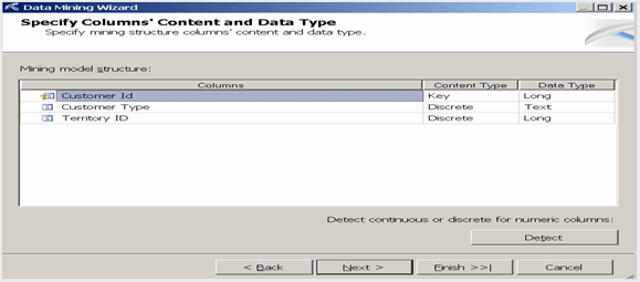 Next page allows us to select for each attribute the respective data and content types. It is very important to select the appropriate content type (discrete or continuous) for the performance and accuracy of the model. Clicking the Detect button causes to sample and analyze the source data for choosing the appropriate content type. In our case, we have described the CustomerID and TerritoryID attributes´content type as discrete for helping the data mining algorithm, as show Figure 7.