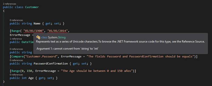 For the EntryDate property, the first argument in the RangeAttribute is the typeof of Property. For the Age property it isn’t necessary. It is mandatory to designate the typeof data in the first argument, whenever the property isn’t a numerical type. If we marked any property not numeric with a RangeAttribute and don't specify this parameter, the project won't compiler