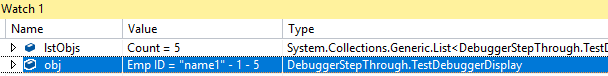 - TestDebuggerDisplay obj = new TestDebuggerDisplay() { ID=1, name="name1" };