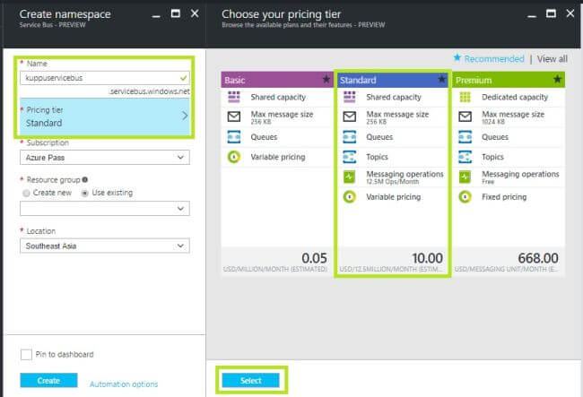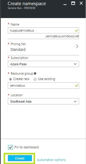 Step 3In creating namespace account blade, enter a namespace name. The system immediately checks to see, if the name is available. After making sure the namespace name is available, choose the pricing tier (Basic, Standard or Premium).