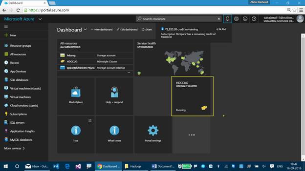 You can find the status of the HDInsight Cluster which is represented as running. If you cannot find the HDInsight Cluster on your Dashboard, then you can find it using the search resource option, available at the top pane.