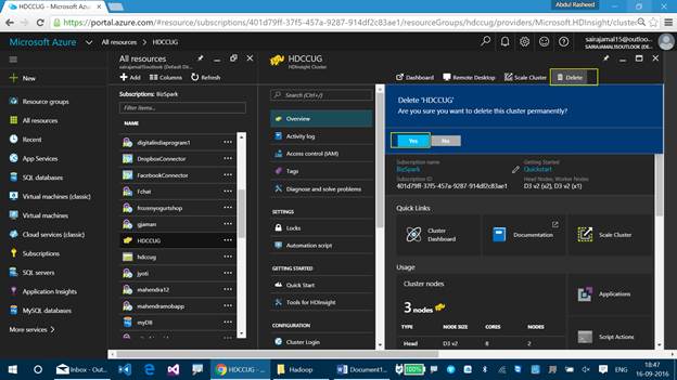 Step 4 - Click on “Delete” option available at the HDInsight Cluster followed by “Yes” to give confirmation to delete the cluster.