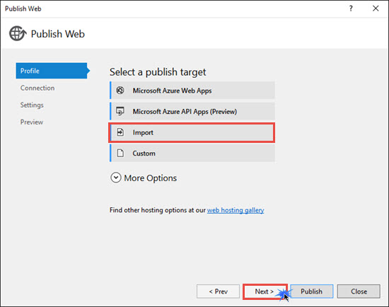 Click More link and subequently click on Get publish profile. After clicking, you will get your Publish setting file, which is required for publishing the Application.