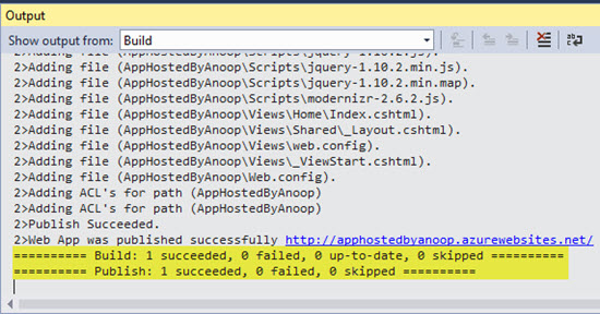 If everything goes fine, you will see a message, stating that the Web app was published successfully in the output Window of Visual Studio.
